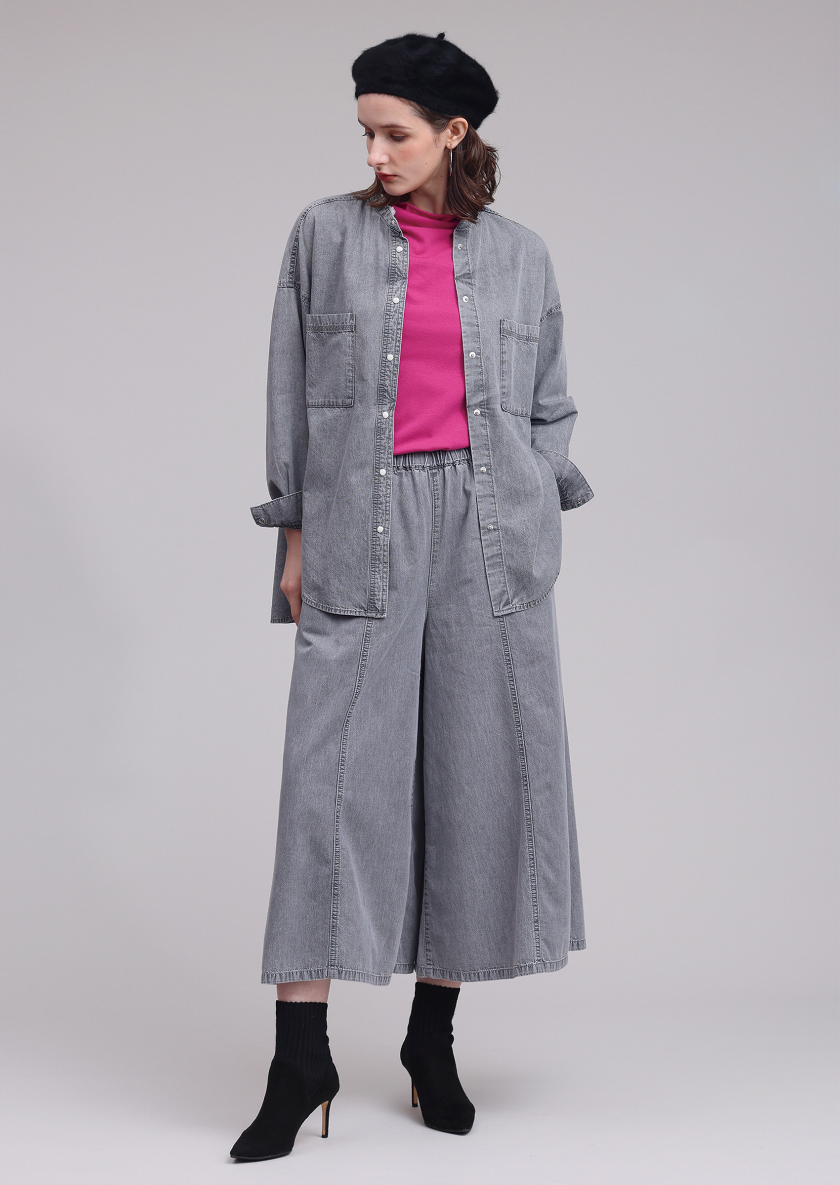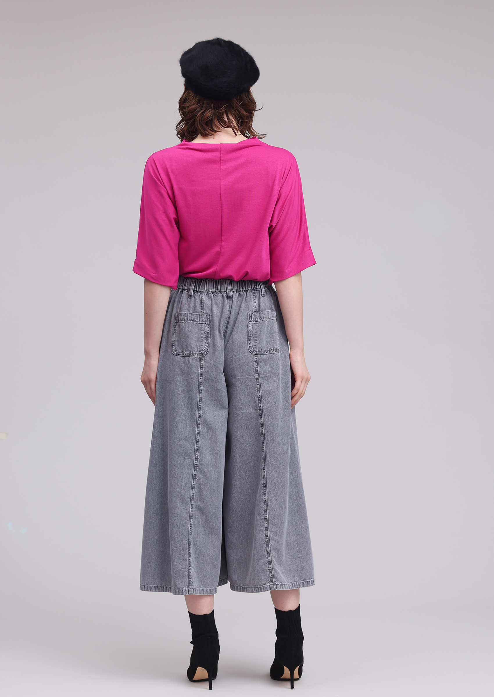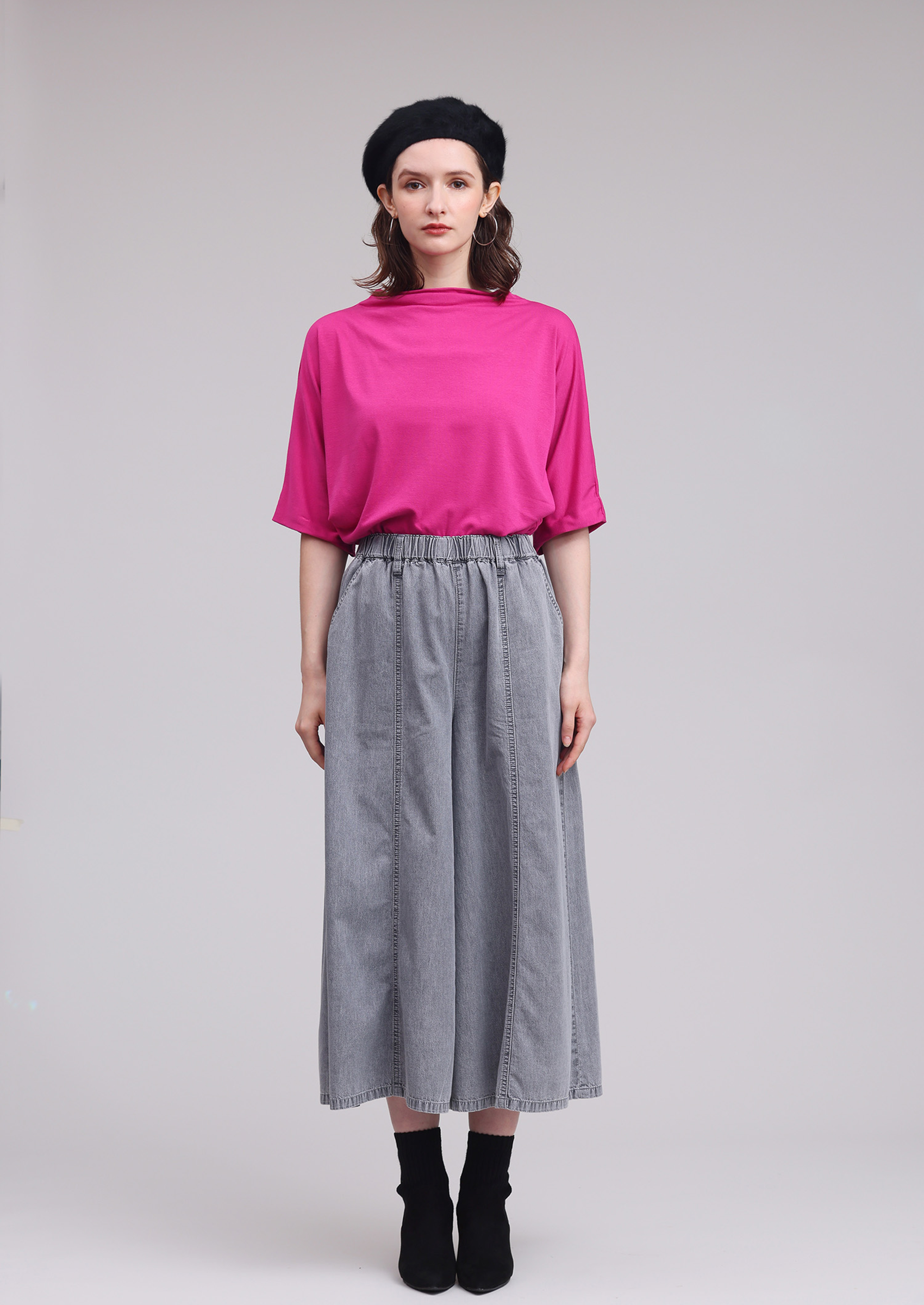 ライトオンスデニムに、バイオフェード加工とケミカル加工を施し、トレンドのグレーカラーを独特の色落ちでヴィンテージの風合いに仕上げました。 フレアシルエットのガウチョパンツはデニムでありながら柔らかくて落ち感があり前後中心の切り替えが縦の強調になり、スッキリとしたシルエットに見えます。単品でも汎用性がありますが、同素材の751-1371とセットアップでルーズ&フレアーシルエットでこなれ感の演出にもかっこいい商品です。