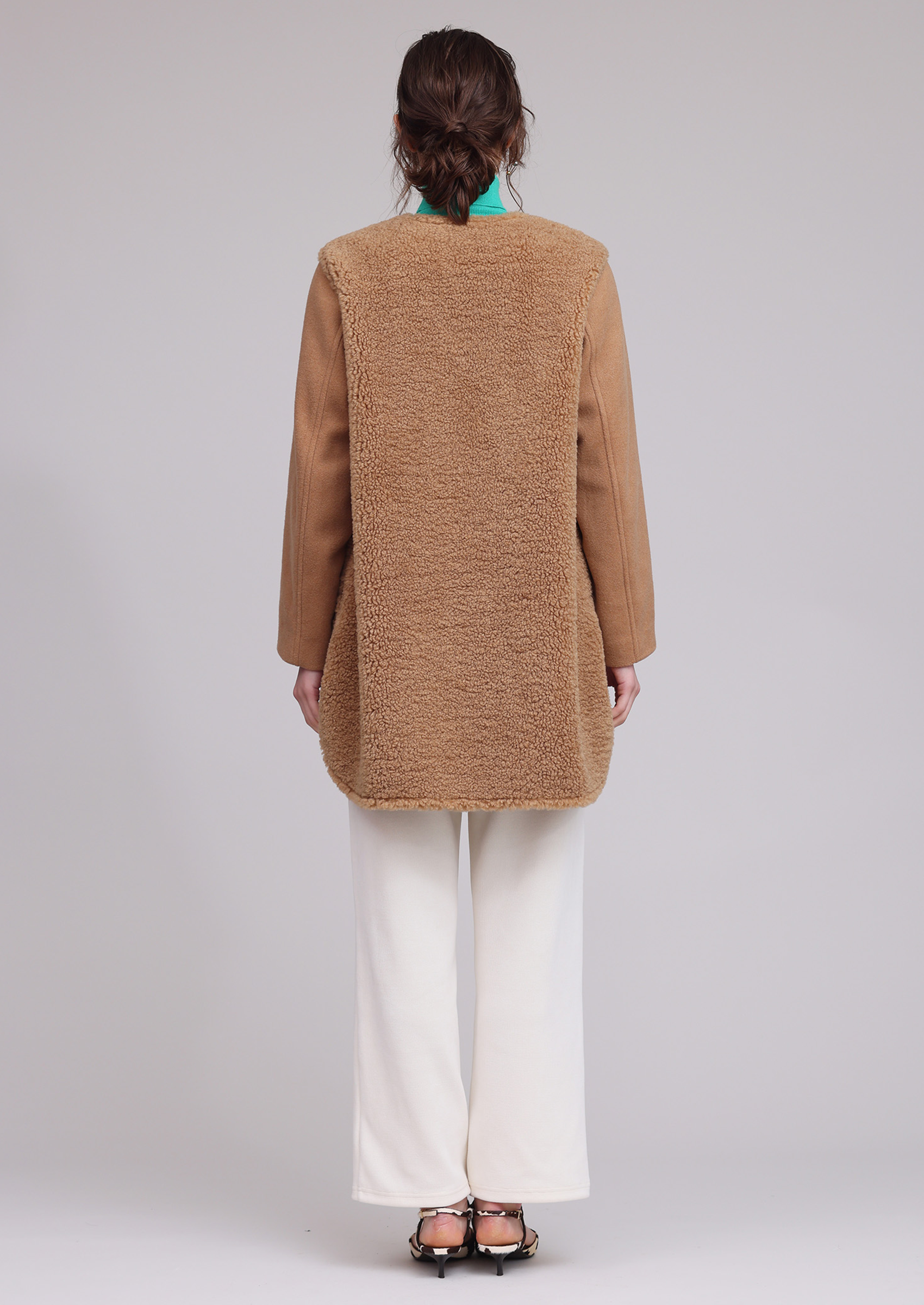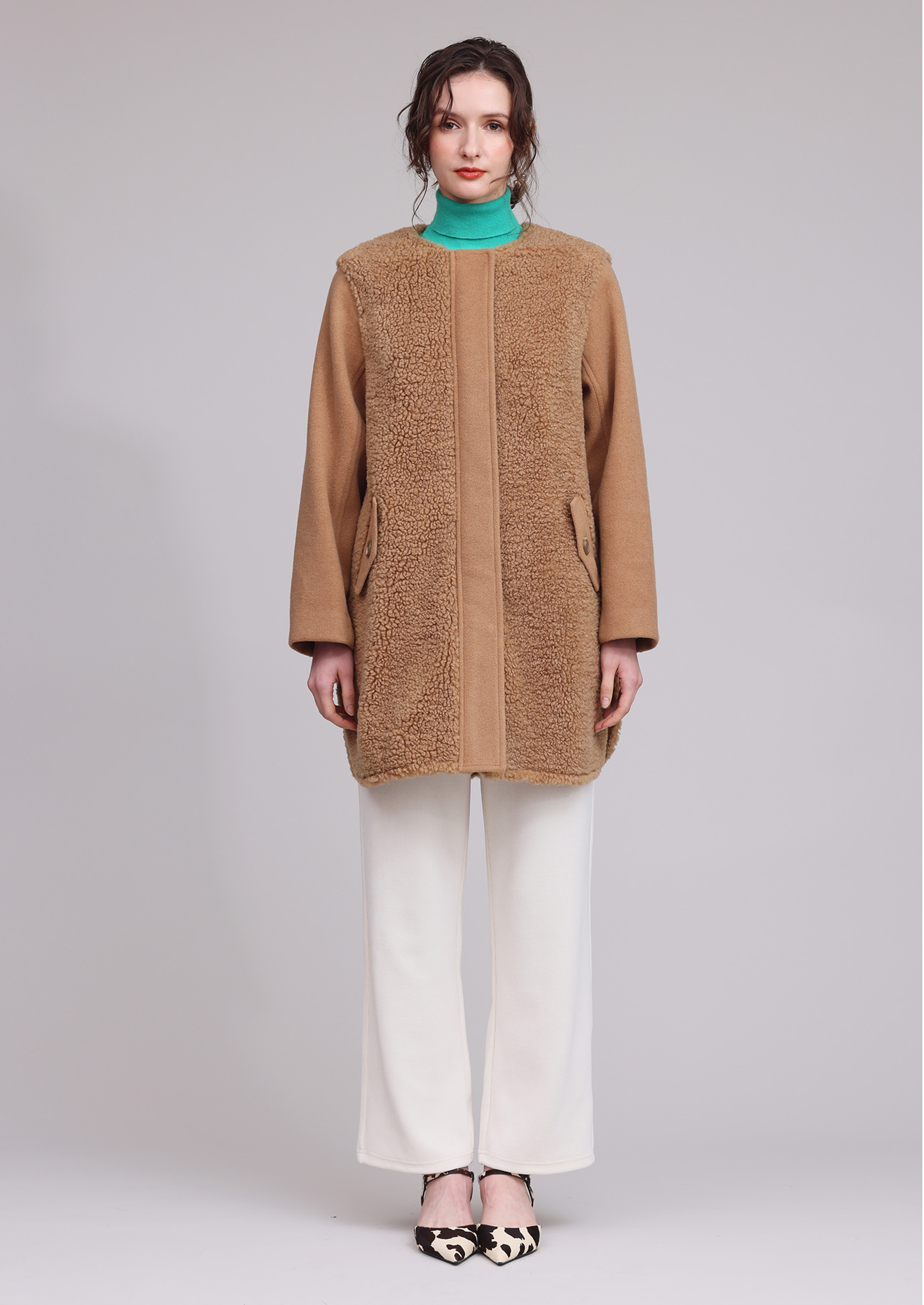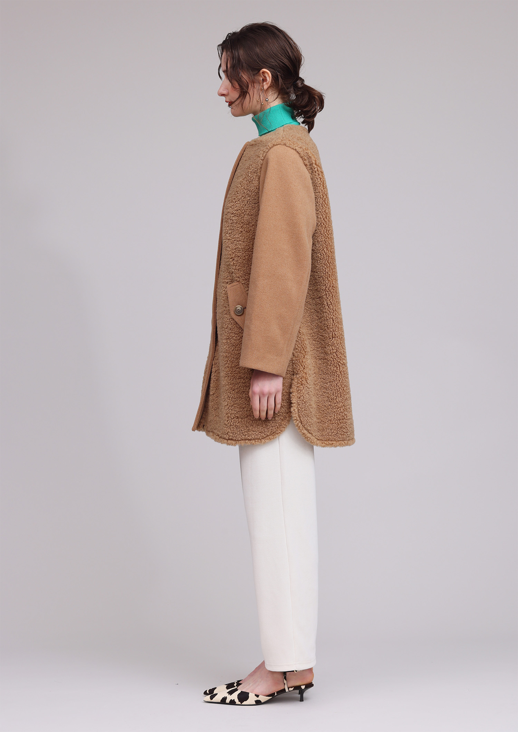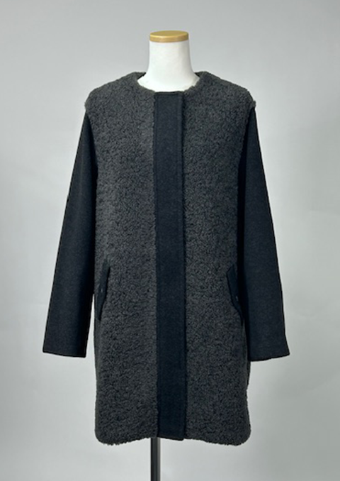 シープボア素材にウールライクのフェルト素材を使い合わせたノーカラーコートです。もこもこした柔らかな肌触りが心地よく繊維の密度が高いため、空気の層を逃がしにくく高い保温性を発揮します。ボリューム感が小顔効果を発揮するのも嬉しいポイントです。甘くなりすぎないフェルト素材をアクセントに大人っぽさを加えました。