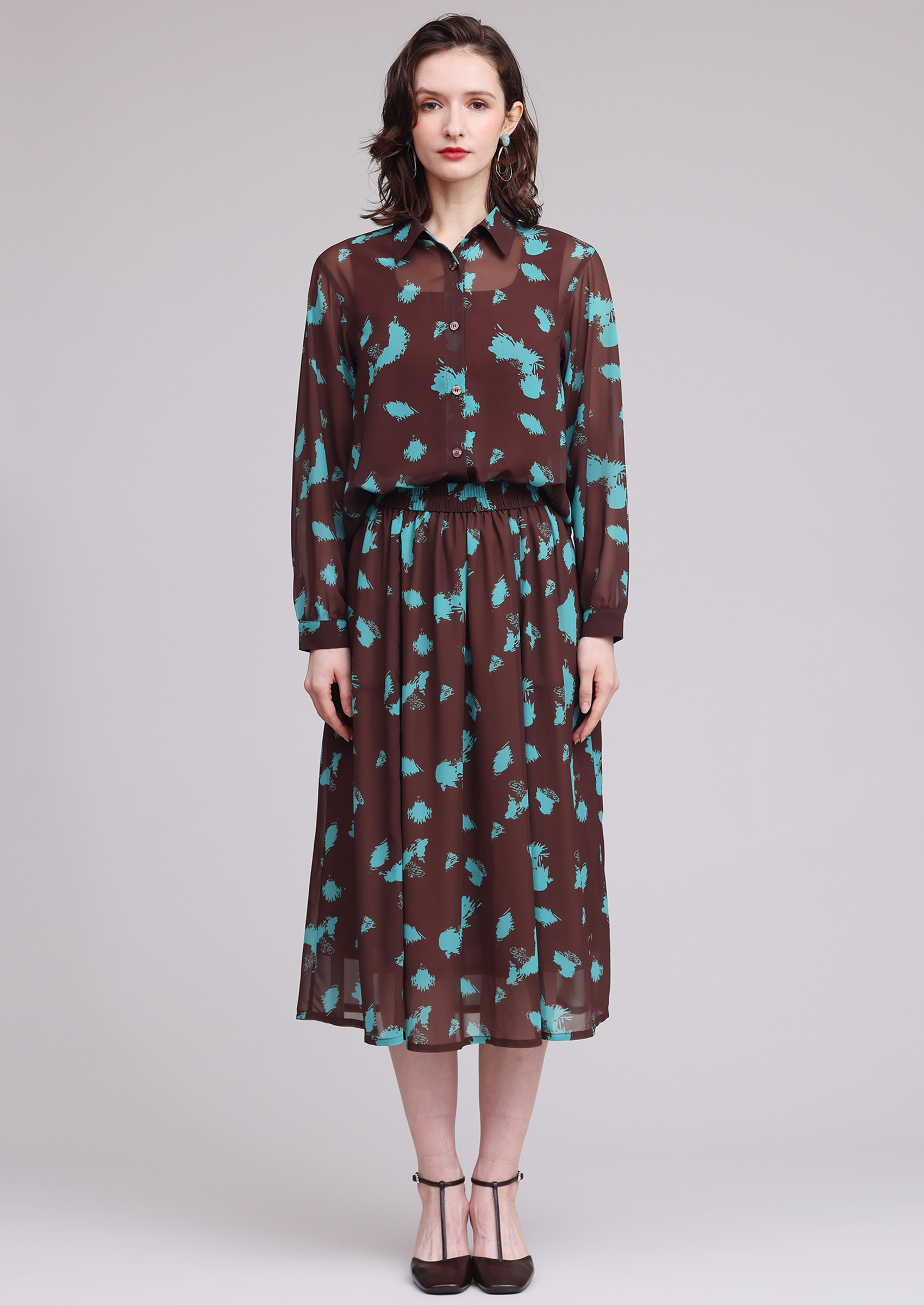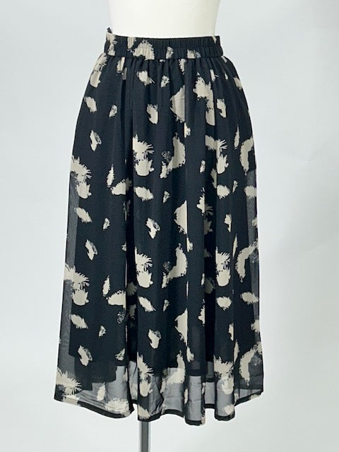 インクスプラッシュ風の柄をデシンにプリントした素材を使用した、6枚接ぎフレアスカートです。6枚接ぎにすることでフレア分量が分散されるので、シースルーの柔らかな風合いをこわすことなく軽快で柔らかな表情を作っています。裏付きなので季節を長く着用していただけます。