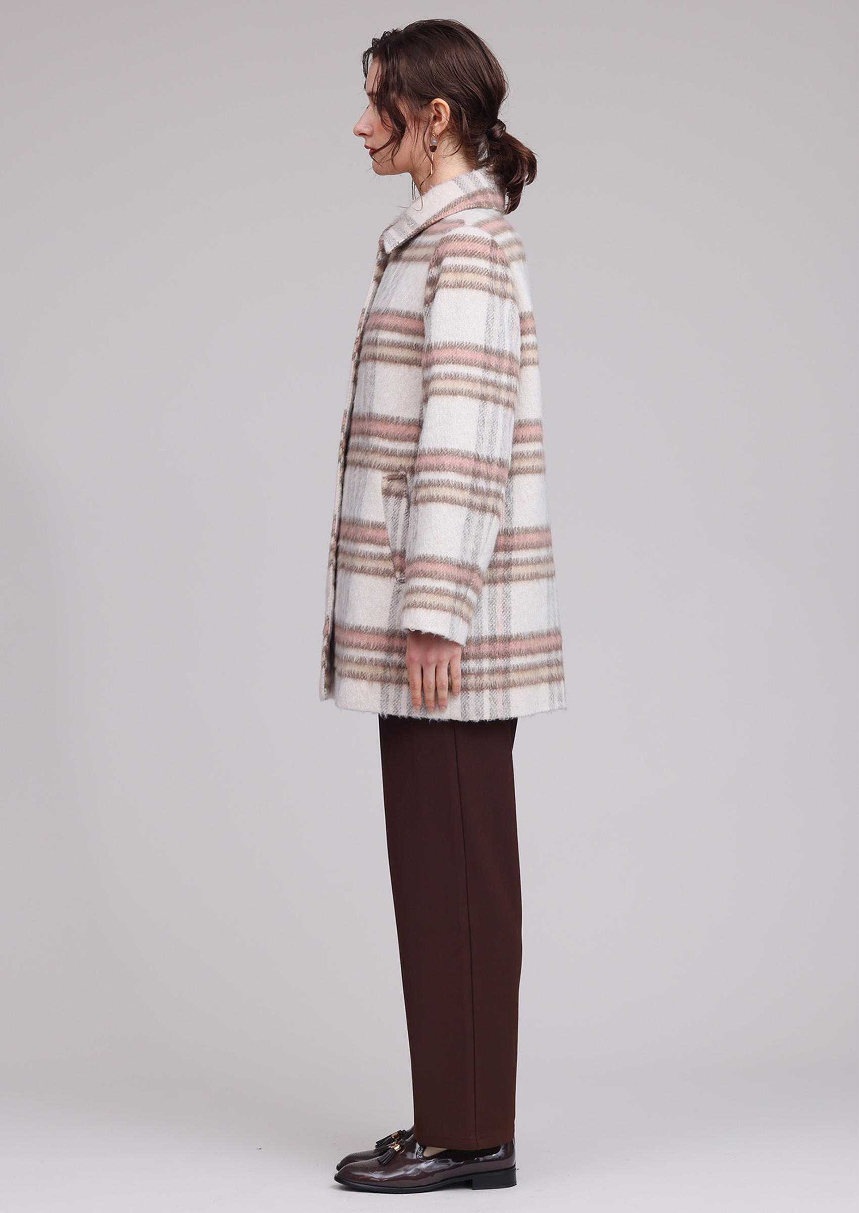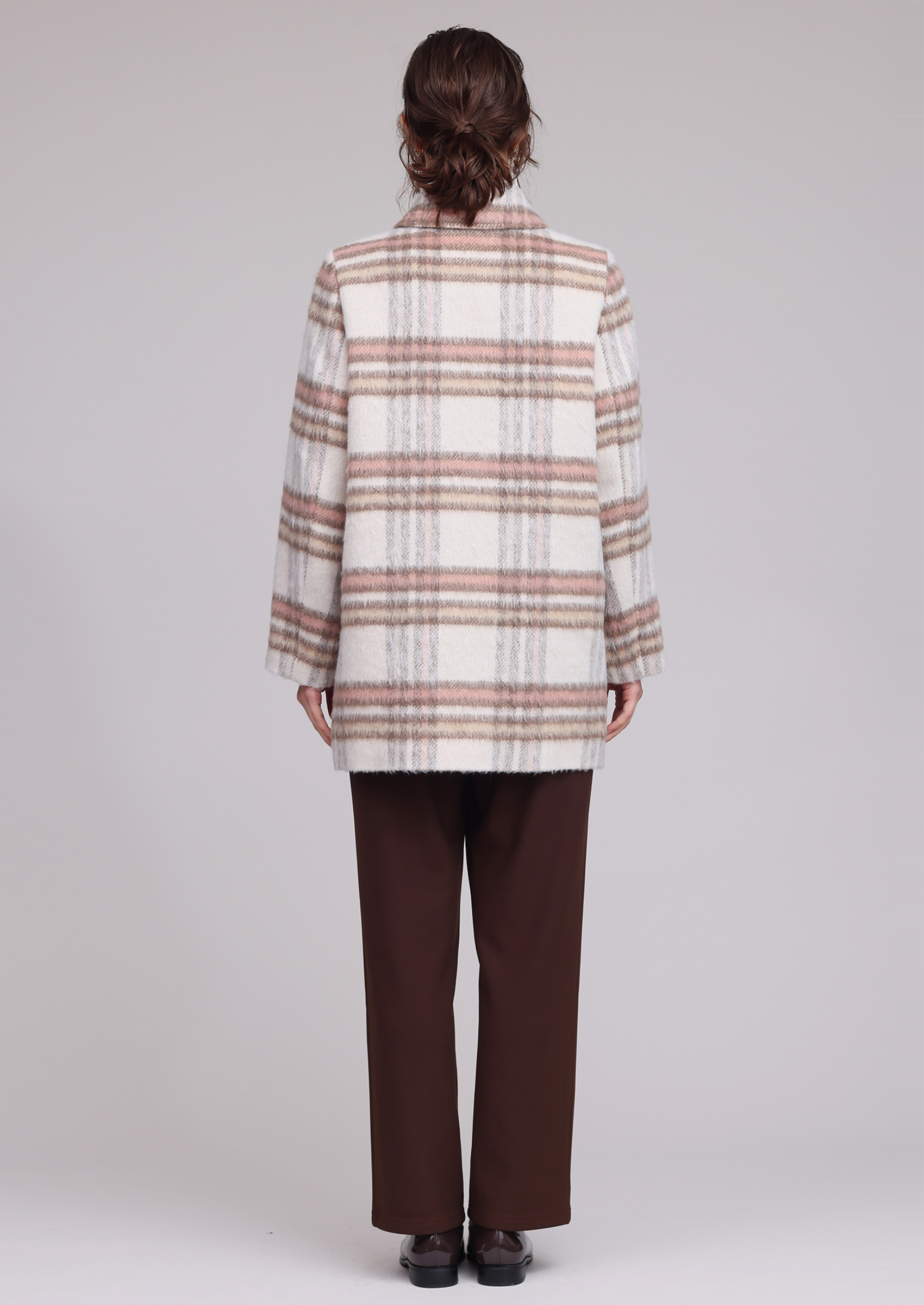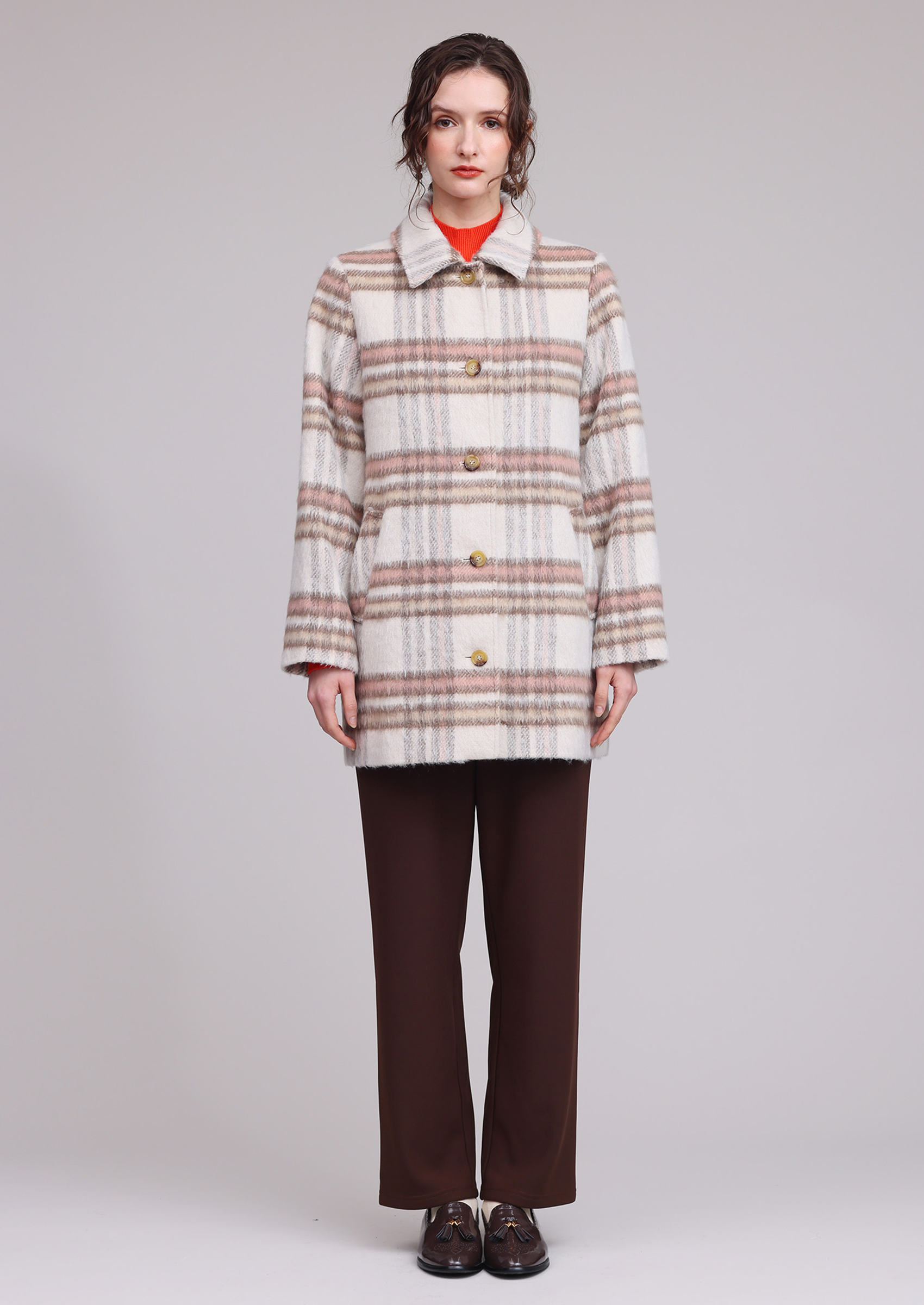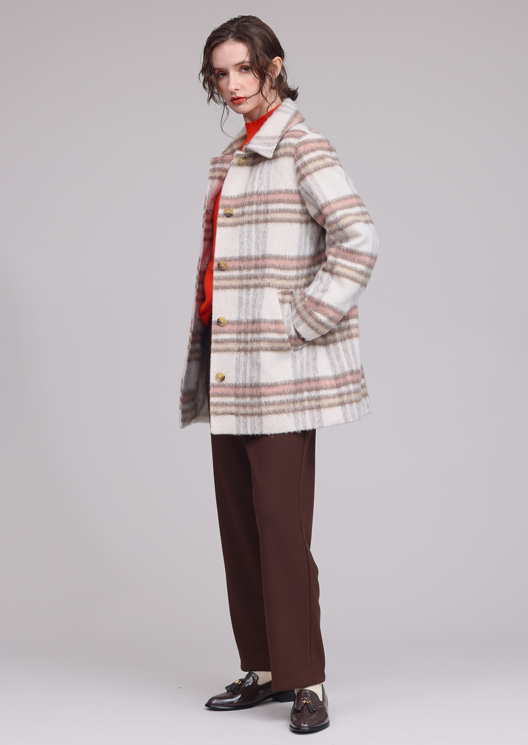 格子柄シャギー素材を使用したステンカラーコートです。シャギーの豊かな毛足により格子柄を柔らかな印象に見せ、シンプルなシルエットを魅力的に演出します。オフィスカジュアルやプライベートとシーンによって違う表情を見せる汎用性の高いコートです。