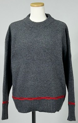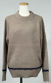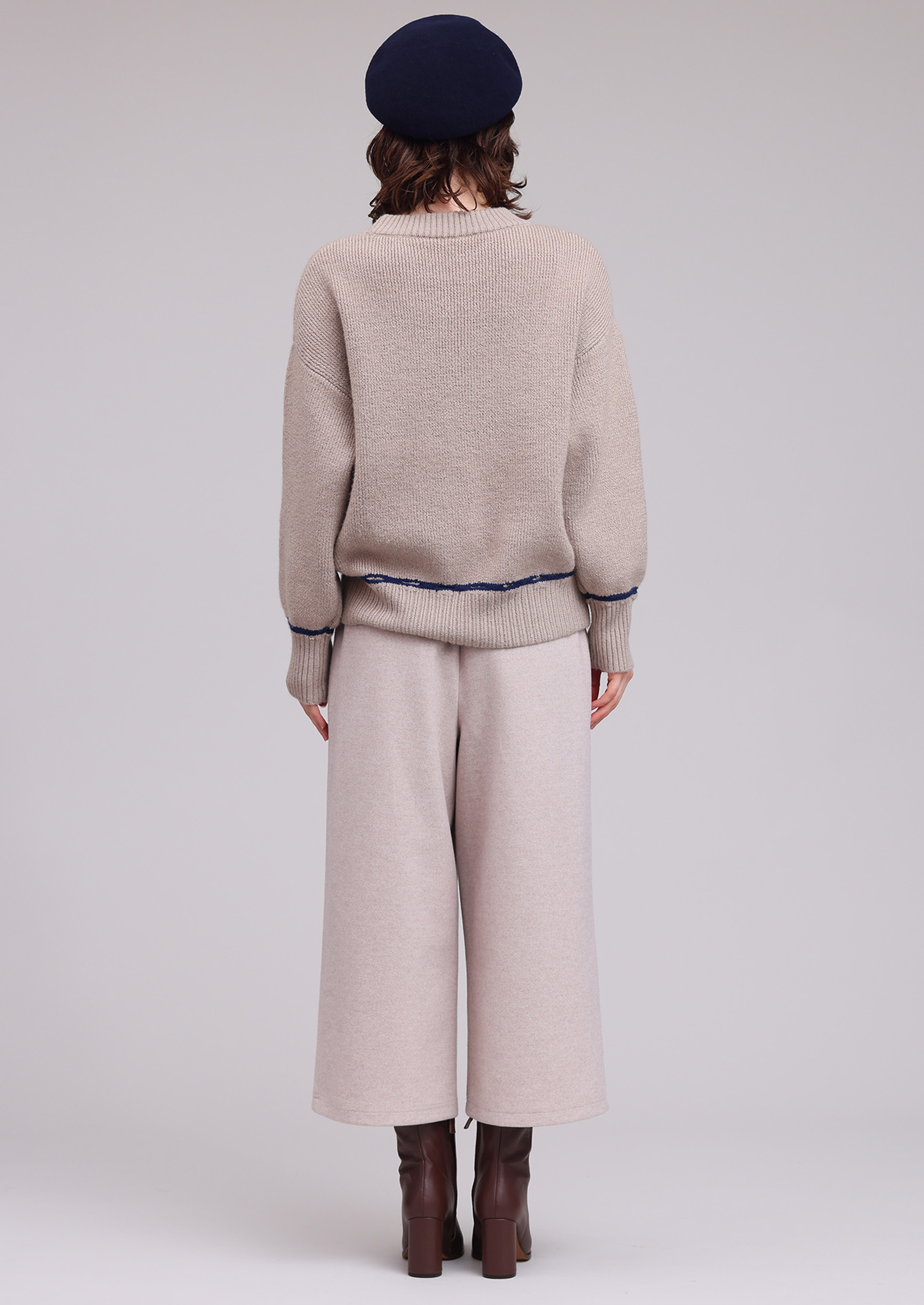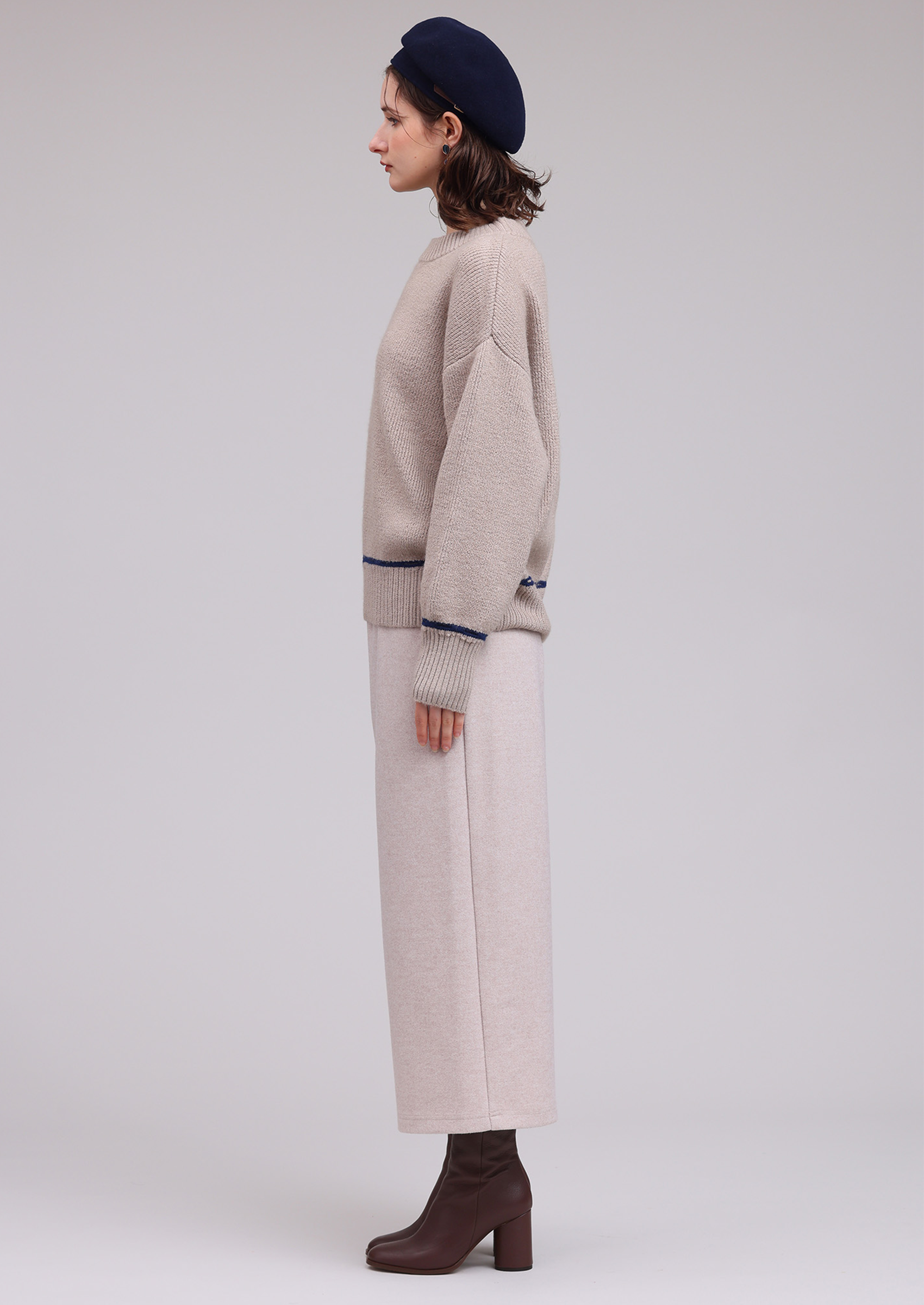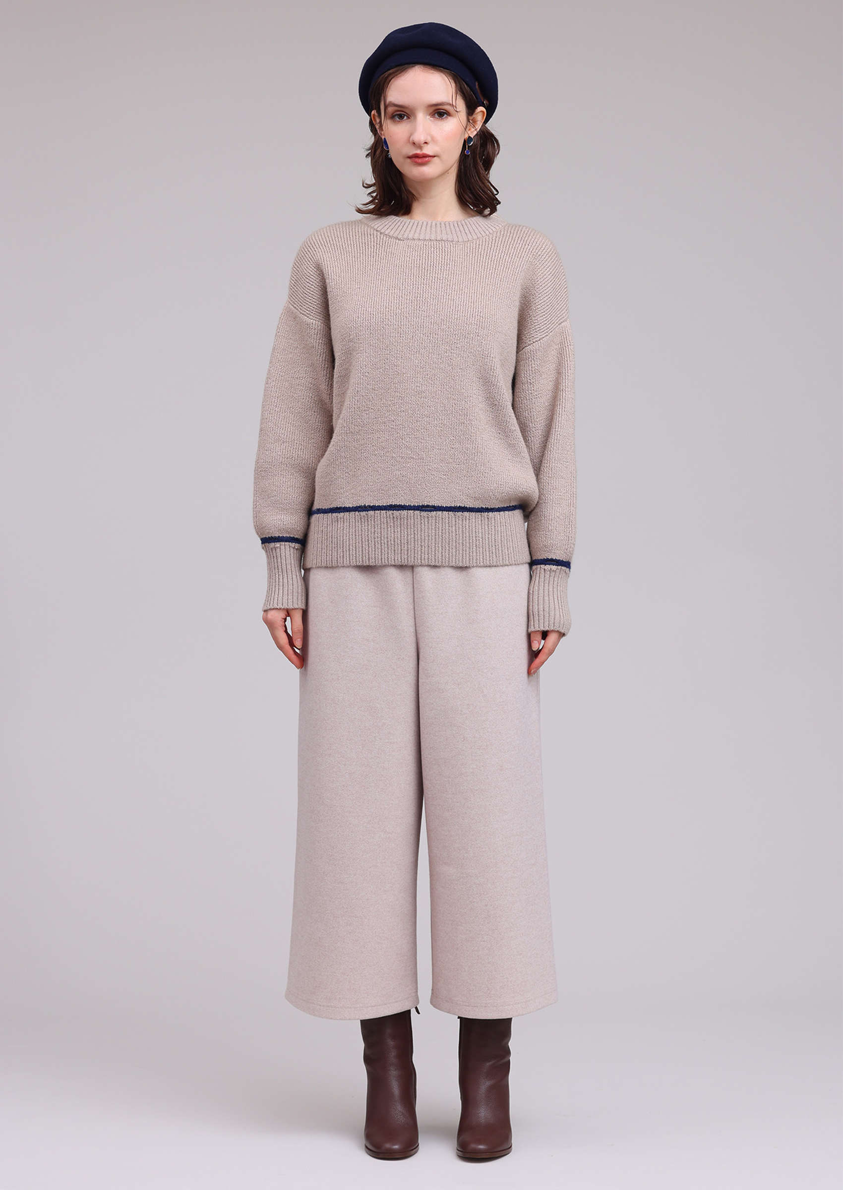 ドロップショルダーでゆったりとした5Gのセーターです。袖口と裾にリングのような模様編みの配色が、さりげないアクセントで全体をゆるく引き締めます。ウールライクのパンツやスカートのスタイリングで、力の抜けた都会的なセットアップで、ミニマルな中に上品さが伺えます。ブークレーの膨らみ感が暖かさを感じさせてくれます。
